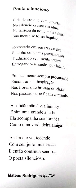 O poema do aluno classificado entre os 250 primeiros foi “Poeta silencioso”. A concorrência foi de vários textos de todo o território nacional que passaram por uma comissão julgadora de três pessoas “com amplo conhecimento em Literatura”, como regia o edital.