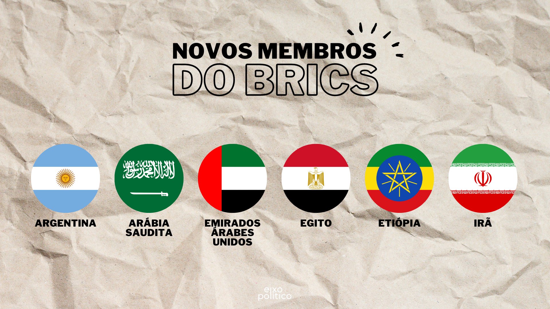 Arábia Saudita, Emirados Árabes Unidos, Argentina, Egito, Irã e Etiópia foram “convidados” a entrar no grupo como membros plenos a partir de 1º de janeiro de 2024, segundo o anúncio do presidente da África do Sul, anfitrião da 15ª cúpula do bloco, que acontece em Joanesburgo.