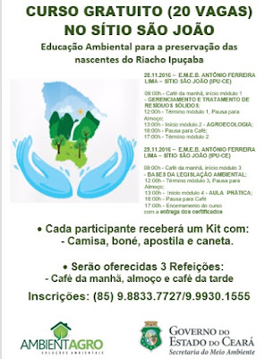 A Secretaria do Meio Ambiente – SEMA, por meio da APA da Bica do Ipu está com inscrições abertas para os cursos de Educação Ambiental para a Preservação das Nascentes do Ipuçaba a serem realizados dos dias 28 de novembro a 01 de dezembro de 2016.