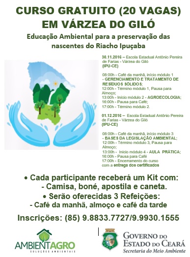A Secretaria do Meio Ambiente – SEMA, por meio da APA da Bica do Ipu está com inscrições abertas para os cursos de Educação Ambiental para a Preservação das Nascentes do Ipuçaba a serem realizados dos dias 28 de novembro a 01 de dezembro de 2016.